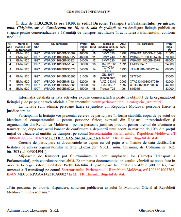 La licitație urmează să fie comercializate 12 automobile marca BMW, cel mai scump dintre ele fiind un model fabricat în 1994 a cărui preț de pornire este de 70 mii de lei.