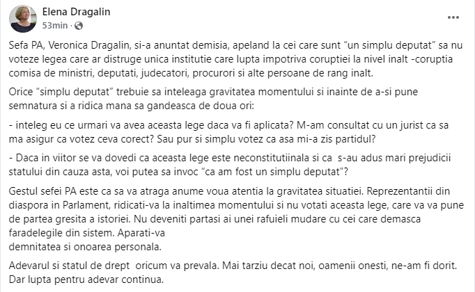 „Șefa PA, Veronica Dragalin, și-a anunțat demisia, apelând la cei care sunt „un simplu deputat” să nu voteze legea care ar distruge unica instituție care luptă împotriva corupției la nivel înalt - corupția comisă de miniștri, deputați, judecători, procurori și alte persoane de rang înalt.