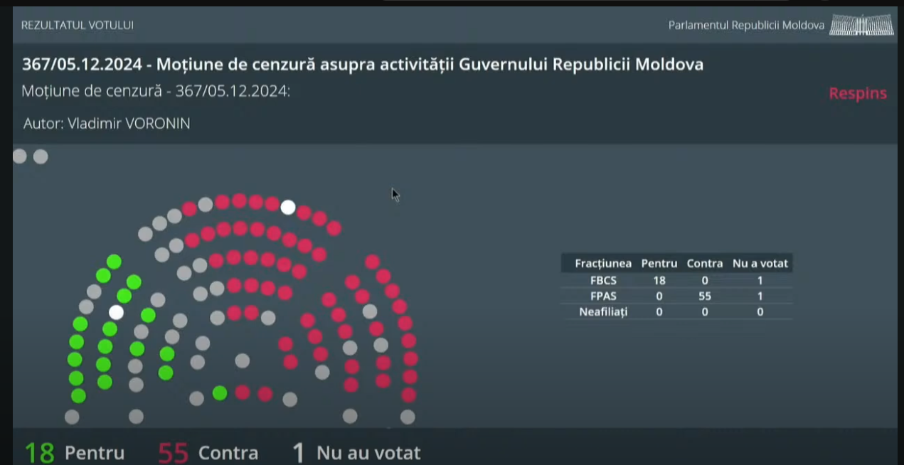 După ce mai mulți deputați au avut luări de cuvânt, speakerul Igor Grosu a supus votului moțiunea, carea acumulat 18 voturi pro și 55 împotrivă.