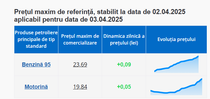 Astfel, litrul de benzina va costa mâine 23,69 lei, iar unul de motorină - 19,84 lei.