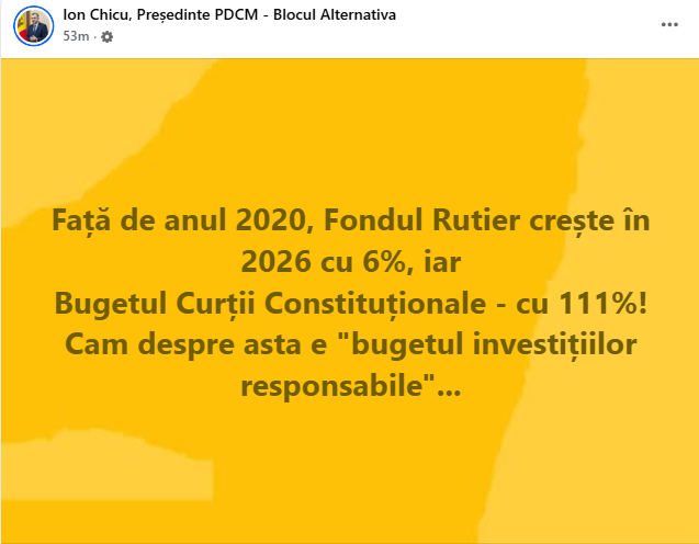 „Față de anul 2020, Fondul Rutier crește în 2026 cu 6%, iar Bugetul Curții Constituționale - cu 111%! Cam despre asta e „bugetul investițiilor responsabile”...”, a scris Ion Chicu, într-o postare pe rețele.