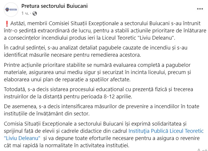 Printre acțiunile prioritare stabilite se numără evaluarea completă a pagubelor materiale, asigurarea unui mediu sigur și securizat în incinta liceului, precum și elaborarea unui plan de reparație a spațiilor afectate.