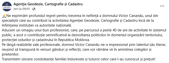 „Ne exprimăm profundul regret pentru trecerea în neființă a domnului Victor Cananău, unul din specialiștii care au contribuit la activitatea Agenției Geodezie, Cartografie și Cadastru încă de la înființarea instituției ca autoritate națională.
