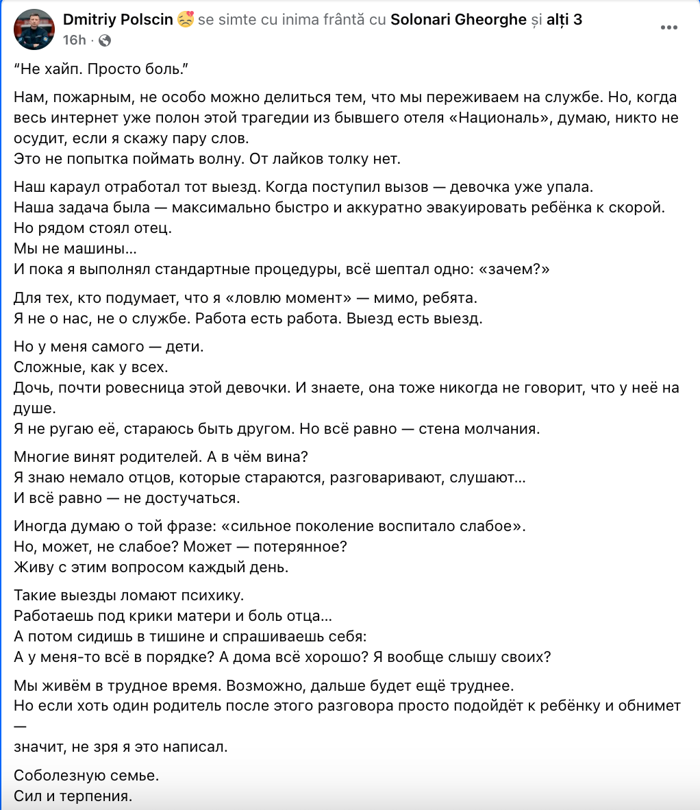 Noi, pompierii, nu prea putem să ne împărțim cu ceea ce trăim în timpul exercitării funcției. Dar când toate rețelele sunt pline cu această tragedie din fostul hotel Național, cred că nu voi fi judecat dacă voi spune câteva cuvinte.