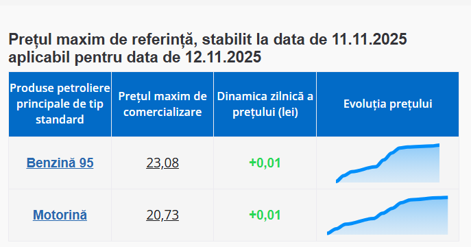 Agenția Națională pentru Reglementare în Energetică (ANRE) a afișat prețuri noi la carburanți pentru mâine, 12 noiembrie. Astfel, litru de motorina și benzină va fi mai scump cu 1 ban.