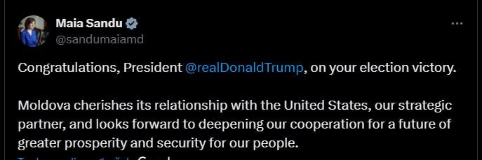 „Felicitări, domnule președinte Donald Trump! Moldova prețuiește relația cu SUA, partenerul nostru strategic, și așteaptă cu nerăbdare să ne aprofundăm cooperarea pentru un viitor de prosperitate și securitate mai mare pentru poporul nostru”, a scris șefa statului pe Platforma X.