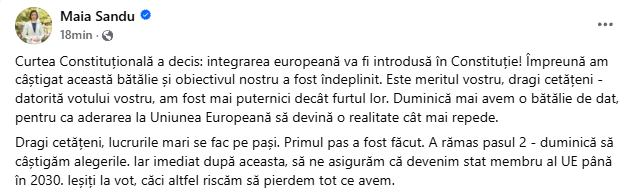 „Este meritul vostru, dragi cetățeni - datorită votului vostru, am fost mai puternici decât furtul lor. Duminică mai avem o bătălie de dat, pentru ca aderarea la Uniunea Europeană să devină o realitate cât mai repede”, a scris șefa statului.