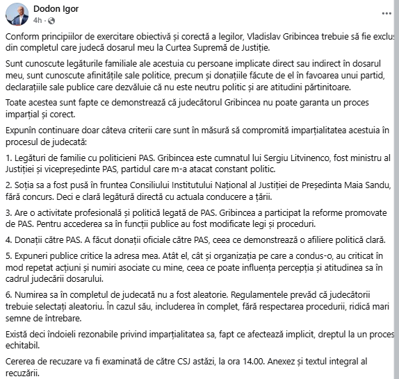 „Conform principiilor de exercitare obiectivă și corectă a legilor, Vladislav Gribincea trebuie să fie exclus din completul care judecă dosarul meu la Curtea Supremă de Justiție.