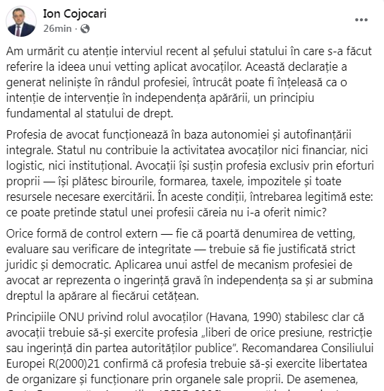 „Am urmărit cu atenție interviul recent al șefului statului în care s-a făcut referire la ideea unui vetting aplicat avocaților. Această declarație a generat neliniște în rândul profesiei, întrucât poate fi înțeleasă ca o intenție de intervenție în independența apărării, un principiu fundamental al statului de drept.
