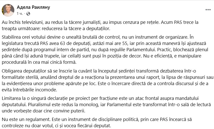 Nu este un regulament. Este un instrument de disciplinare politică, prin care PAS încearcă să controleze nu doar votul, ci și vocea fiecărui deputat”, a scris Adela Răileanu.
