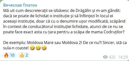 „Mă uit cum descreierații se izbăvesc de Dragalin și m-am gândit: dacă se poate de lichidat o instituție și să înființezi în locul ei aceeași instituție, doar că cu o denumire ușor modificată, scăpând în context de conducătorul instituției lichidate, atunci de ce nu se poate face exact asta cu țara pentru a scăpa de mama Codruților? De exemplu: Moldova Mare sau Moldova 2! De ce nu?! Sincer, stă ca sula-n coaste”, a scris Veaceslav Platon.