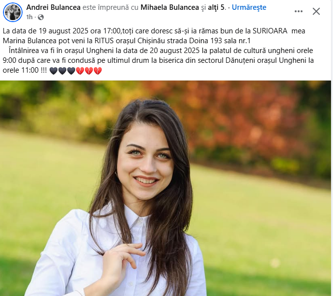 Pe data de 20 august 2025 corpul neînsuflețit al tinerei va fi adus la palatul de cultură din Ungheni la orele 9:00, după care va fi condusă pe ultimul drum la biserica din localitatea Dănuțeni”, se arată în mesajul scris de fratele tinerei.