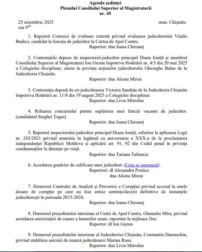 Membrii CSM examinează raportul Comisiei de evaluare externă privind evaluarea judecătorului Vitalie Budeci, candidat la funcția de judecător la Curtea de Apel Centru.
