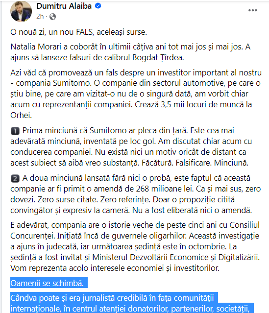 Fiți vigilenți, vă rog. Am impresia că din aceeași sursă vor fi încă multe minciuni”, a scris Dumitru Alaiba pe Facebook.