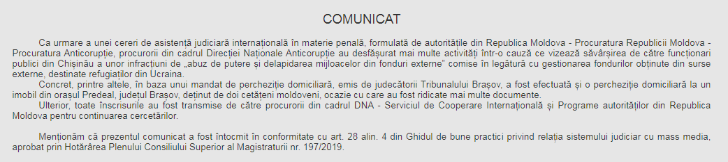 „Ca urmare a unei cereri de asistență judiciară internațională în materie penală, formulată de autoritățile din Republica Moldova - Procuratura Republicii Moldova - Procuratura Anticorupție, procurorii din cadrul Direcției Naționale Anticorupție au desfășurat mai multe activități într-o cauză ce vizează săvârșirea de către funcționari publici din Chișinău a unor infracțiuni de „abuz de putere și delapidarea mijloacelor din fonduri externe” comise în legătură cu gestionarea fondurilor obținute din surse externe, destinate refugiaților din Ucraina.