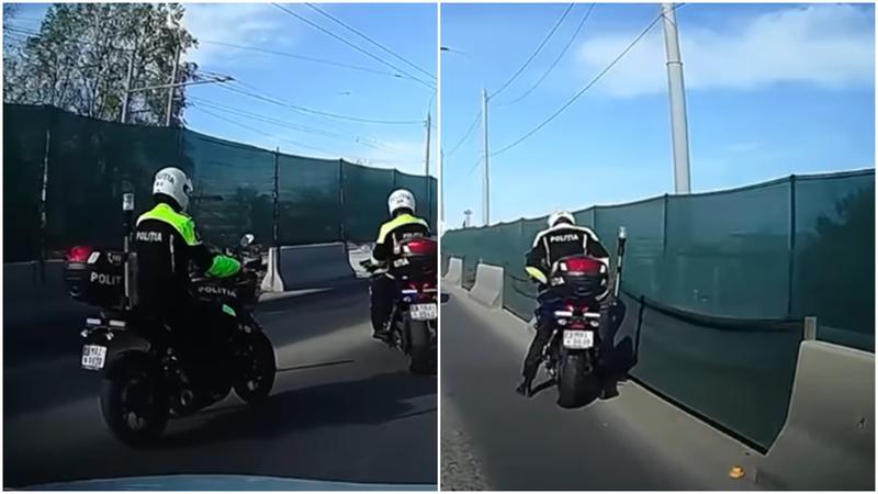 Din imagini se vede cum trei polițiști cu motocicletele de deplasează printre mașini. La un moment dat, ultimul dintre ei a pierdut controlul asupra ghidonului și s-a prăbușit, cu tot cu motocicleta, pe șosea.