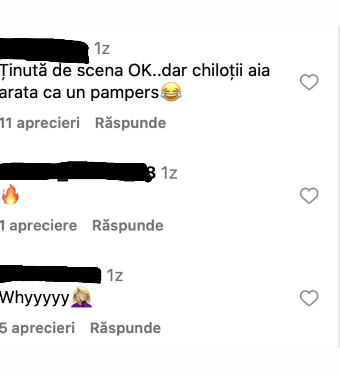 „Chiar așa?! S-a ridicat la cap popularitatea… serios ? Îmi place cum cântă, dar nu și cum se îmbracă ”, „Ținută de scenă OK… dar chiloții aia arată ca un pampers”, „Are chiloți și pampers?!”, „ti se văd chilotii…mai mare rușinea”, sunt doar câteva dintre comentariile internauților la postarea de pe Instagram.
