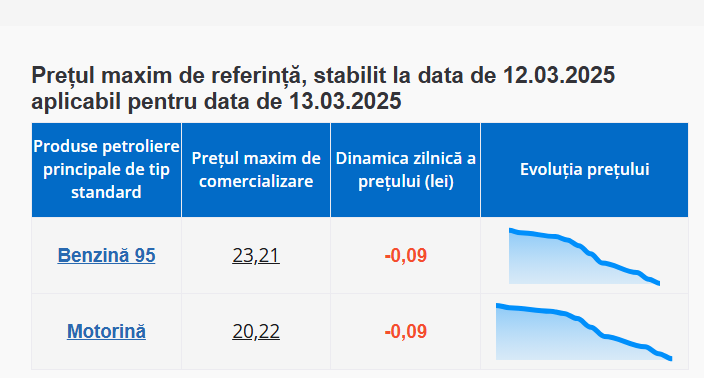 Agenția Națională pentru Reglementare în Energetică a afișat noile prețuri la carburanți pentru mâine, 13 martie. Astfel, prețul motorinei și al benzinei scade cu 9 bani.