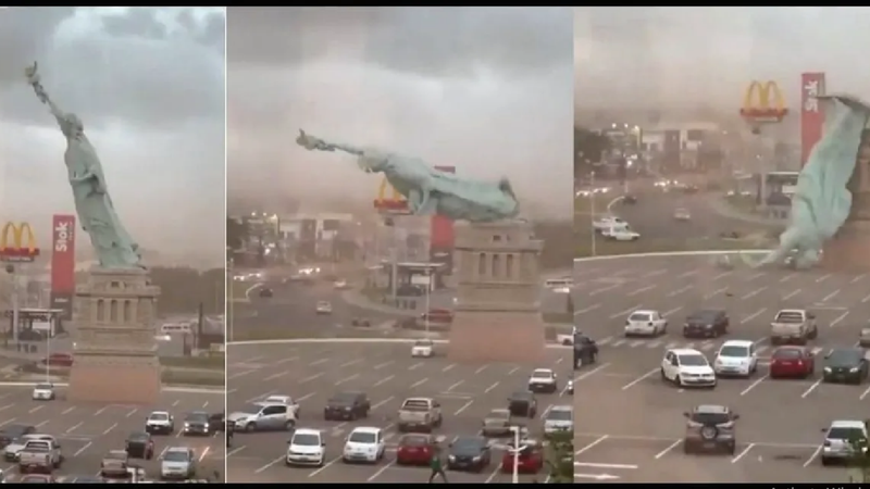 În timpul rafalelor violente, Statuia Libertății din Guaiba, o construcție impunătoare de 24 de metri înălțime, amplasată în exteriorul unui magazin, a cedat. Imaginile arată cum structura este înclinată de vânt, înainte de a se desprinde și de a cădea de pe piedestal.