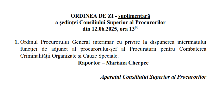 Mariana Cherpec: Prin ordinul PG interimar din 11 iunie 2025, Denis Rotaru, procuror în cadrul PCCOCS a fost desemnat să exercite interimatul funcției de adjunct al șefului Procuraturii pentru Combaterea Criminalității Organizate și Cauze Speciale, din data de 16 iunie curent. Alexandru Machidon a înaintat CSP un demers prin care a solicitat aprobarea ordinului emis. Denis Rotaru are o vechime ăn muncpă în funcția de procuror de 19 ani, la ultima evaluare a performanțelor profesionale a obținut calificativul foarte bine și de-a lungul carierei sale a fost stimulat în mod repetat pentru rezultatele obținute.