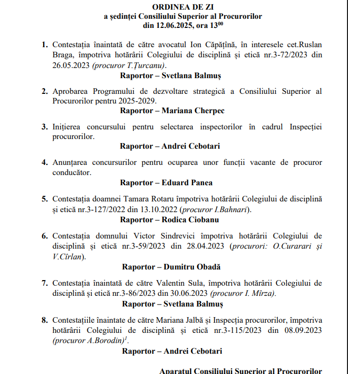 CSP examinează contestațiile înaintate de către Mariana Jalbă și Inspecția procurorilor, împotriva hotărârii Colegiului de disciplină și etică nr. 3-115/2023 din 08.09.2023 (procuror A. Borodin).