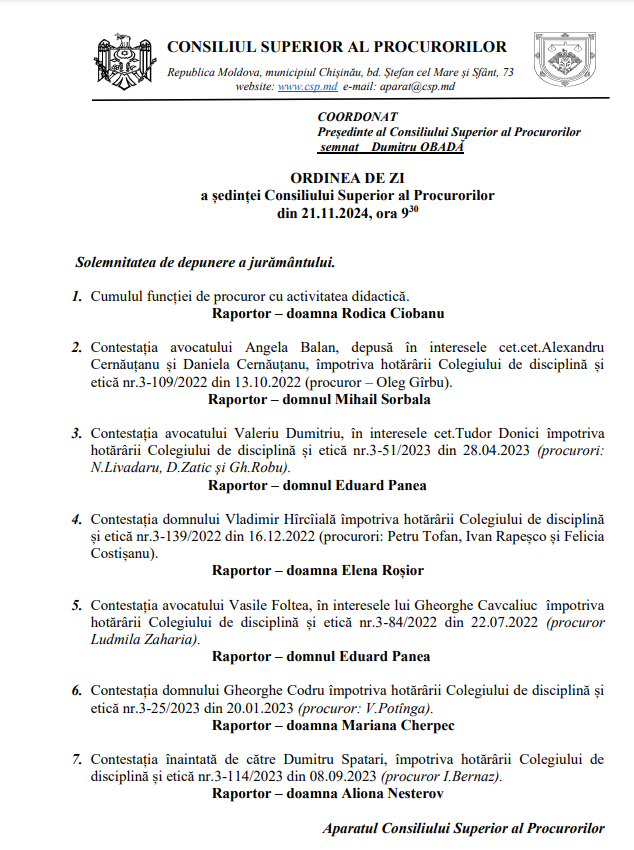 10:25 CSP examinează cu ușile închise contestația avocatului Vasile Foltea, în interesele lui Gheorghe Cavcaliuc împotriva hotărârii Colegiului de disciplină și etică nr.3-84/2022 din 22.07.2022 (procuror Ludmila Zaharia).