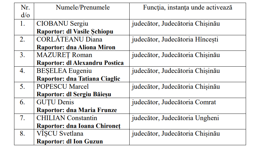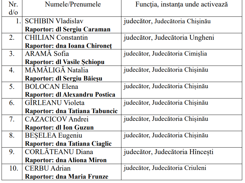 Lista candidaţilor care au depus cereri de participare la concurs pentru suplinirea posturilor vacante de judecător la Curtea de Apel Chișinău: