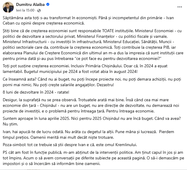 Ivan, hai apucă-te de lucru odată. Nu arăta cu degetul la alții. Pune mâna și lucrează. Pierdem timpul prețios. Oamenii merită mai mult decât niște trotuare”, se arată în mesajul scris de Alaiba pe Facebook.