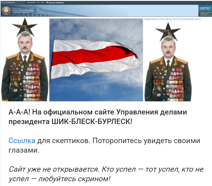 Mai mult, o zi mai devreme a fost piratat și site-ul biroului președintelui Belarusului. Pe pagina principală a apărut un steagul alb-roşu-alb, steagul Belarusului la începutul anilor 1990, și fotografii cu șeful departamentului Viktor Șeiman, deghizat în artistul rus Verka Serduchka.