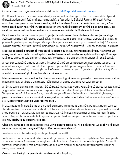 „Pe data 20 mai, tatăl meu, vârstnic, imobilizat și cu un tablou clinic grav (stare de vomă, delir, lipsă de diureză, abdomen și față umflate, hemoragie), a fost adus la Spitalul Raional Hîncești. A fost consultat doar pentru probleme gastrice, fără a i se identifica cauza reală. La scurt timp, a fost trimis acasă cu o mașină de taxi, fără investigații suplimentare, fără tratament și fără diagnostic clar. L-au cărat un taximetrist, un brancardier și mama mea – în vârstă de 70 de ani, bolnavă.
