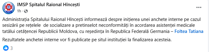 „Administrația Spitalului Raional Hîncești informează despre inițierea unei anchete interne pe cazul sesizării pe rețelele de socializare a pretinselot neconformități în acordarea asistenței medicale tatălui cetățencei Republicii Moldova, cu reședința în Republica Federală Germania – Foltea Tatiana. Rezultatele anchetei interne vor fi publicate pe situl instituției la finalizarea acesteia”, se arată în comunicatul emis de responsabilii de la Spital.