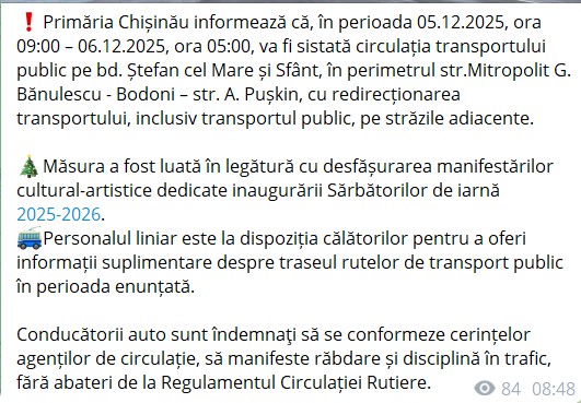 Restricția este impusă în contextul desfășurării manifestărilor cultural-artistice dedicate inaugurării Sărbătorilor de Iarnă 2025–2026. Pe durata suspendării traficului, rutele de transport public vor fi redirecționate pe străzile adiacente, iar personalul liniar va oferi călătorilor informații despre itinerarele alternative.