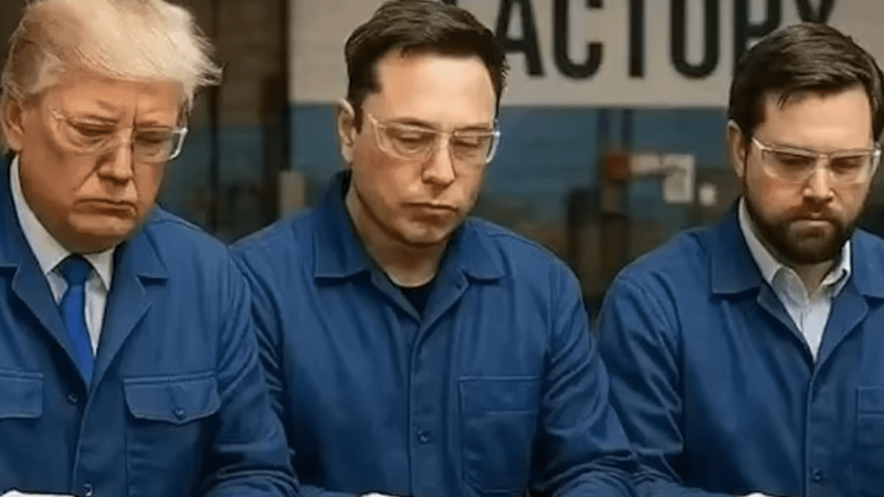 Într-unul dintre cele mai distribuite videoclipuri, Trump, Elon Musk și JD Vance apar caricaturizați într-o fabrică, muncind pe o linie de producție de pantofi sport, o aluzie ironică la eforturile administrației americane de a relocaliza producția în țară, în cadrul „Planului de revigorare a industriei americane”.
