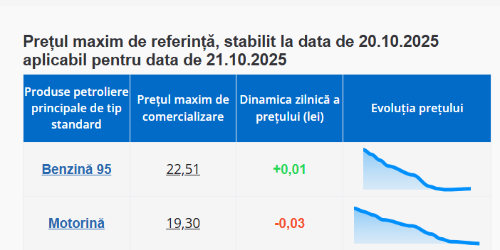 Agenția Națională pentru Reglementare în Energetică (ANRE) a afișat prețuri noi la carburanți pentru mâine, 21 octombrie. Astfel, un litru de motorina va fi mai ieftin cu 3 bani, iar prețul benzinei crește cu un ban.