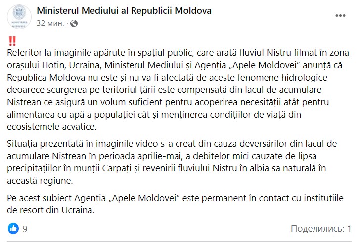 „Referitor la imaginile apărute în spațiul public, care arată fluviul Nistru filmat în zona orașului Hotin, Ucraina, Ministerul Mediului și Agenția „Apele Moldovei” anunță că Republica Moldova nu este și nu va fi afectată de aceste fenomene hidrologice deoarece scurgerea pe teritoriul țării este compensată din lacul de acumulare Nistrean ce asigură un volum suficient pentru acoperirea necesității atât pentru alimentarea cu apă a populației cât și menținerea condițiilor de viață din ecosistemele acvatice.