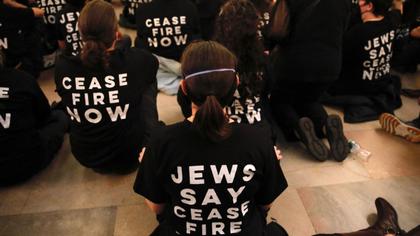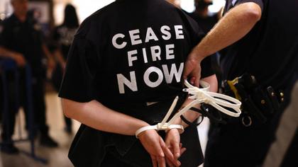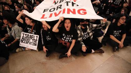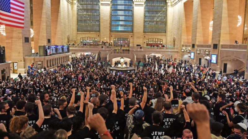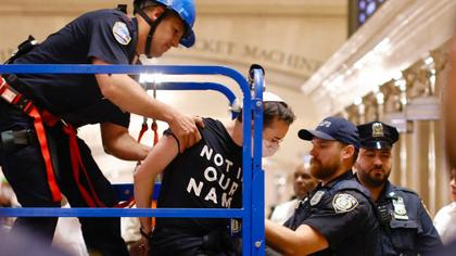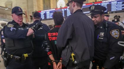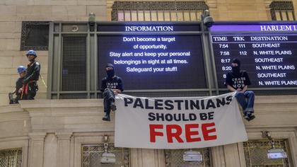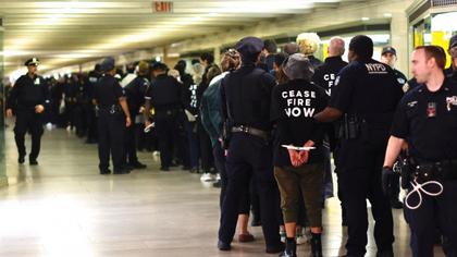 Sute de protestatari au blocat parțial Grand Central din New York, probabil cea mai cunoscută gară din Statele Unite. S-au adunat în fața clădirii, unde au cerut oprirea războiului din Orientul Mijlociu, după care unii au pătruns în interior. Manifestația s-a încheiat cu reținerea a peste 100 de oameni.