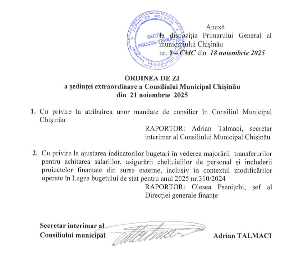 Consiliul Municipal Chișinău (CMC) se întrunește astăzi într-o ședință extraordinară. Pe oridinea de zi figurează 2 subiecte.