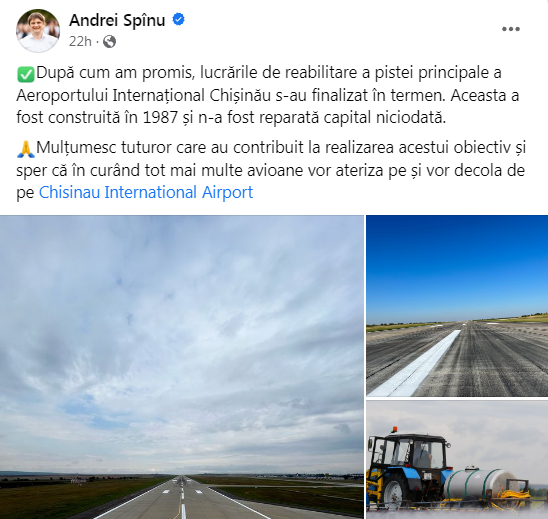 „S-a reușit reparația rosturilor între dalele de beton, betonarea suprafețelor cu beton armat, reparația deteriorărilor cu beton special cu întărire rapidă, schimbarea cablajului de alimentare a luminilor centrale a pistei, frezarea cu diamant a denivelărilor, efectuarea lucrărilor de planietate, spălarea pistei de resturi de cauciucuri ale aeronavelor cât și restabilirea în totalitate a marcajului vizual.