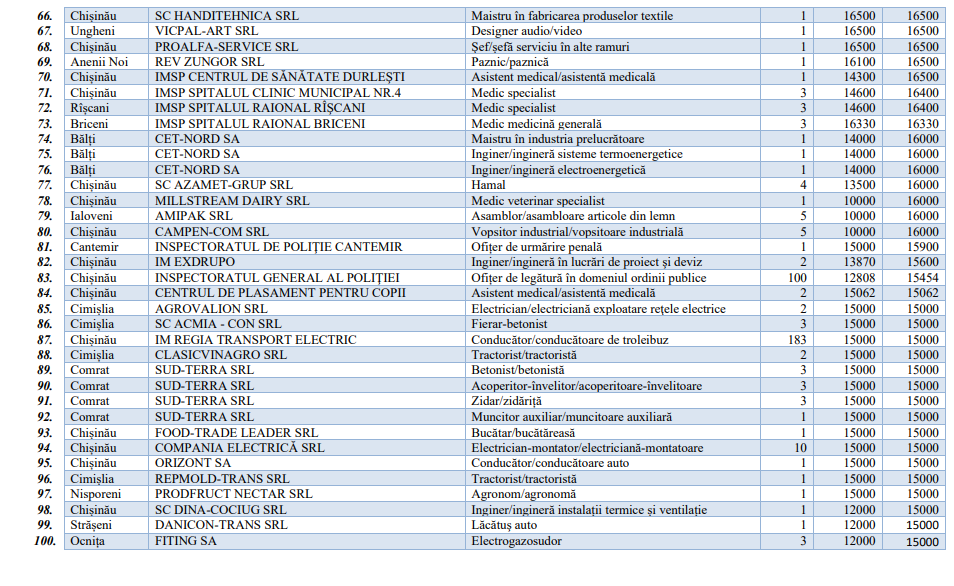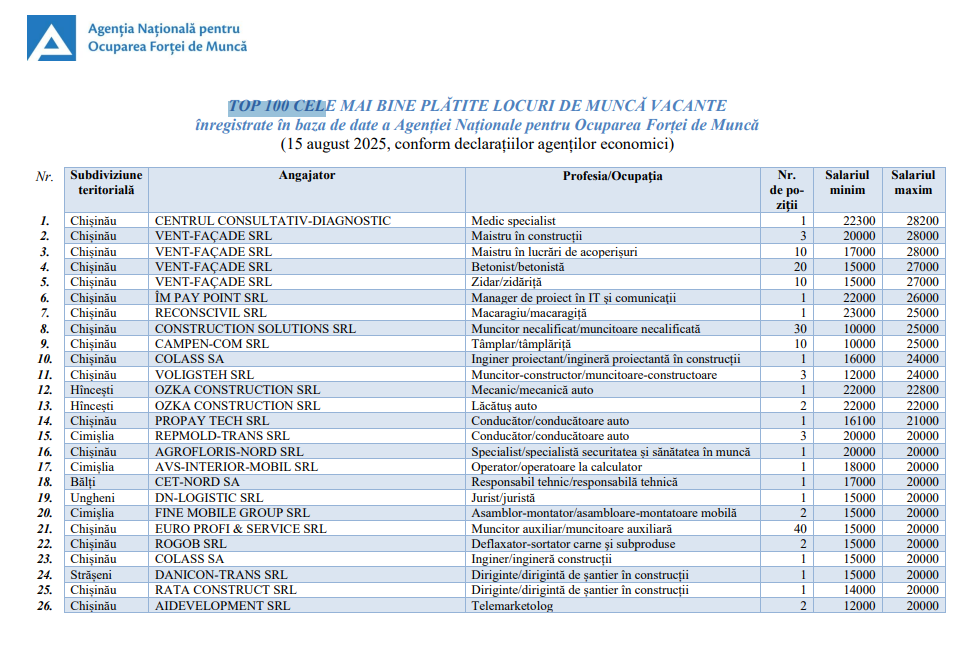 Astfel, prima în topul ANOFM al celor mai plătite funcții din țară este cea de medic specialist la un centru consultativ din capitală, salariul maxim ridicându-se la 28.200 lei.