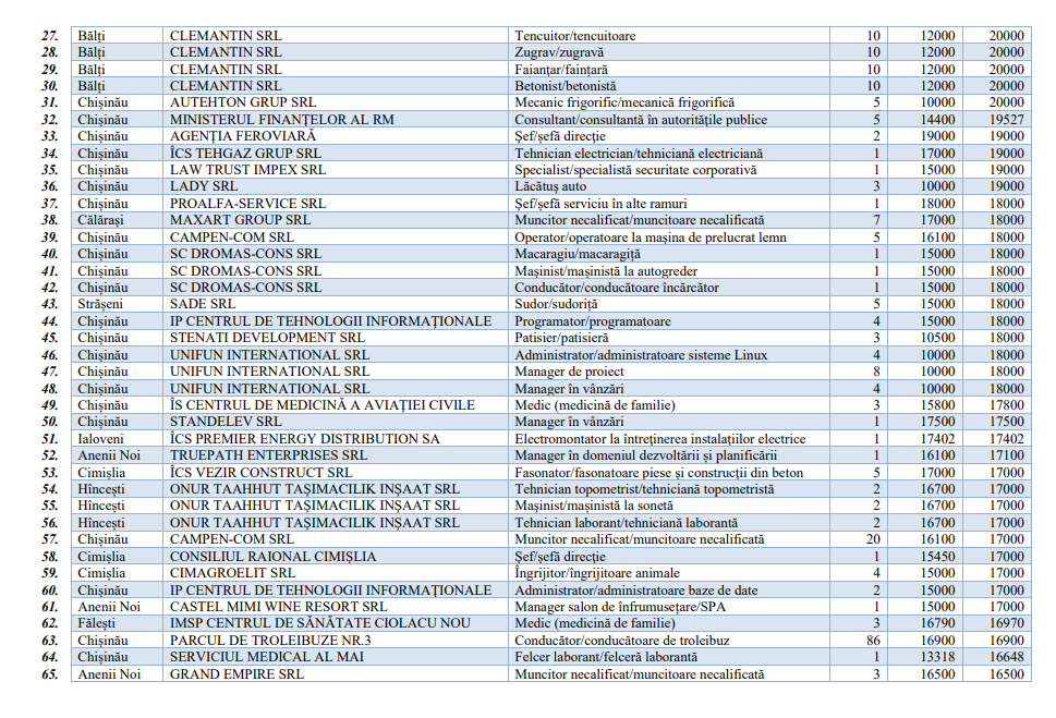 Pe următoarele 10 poziții sunt incluse joburi la fel din capitală, dar din diferite domenii: maistru în construcții, maistru în lucrări de acoperișuri, betonist, zidar, manager de proiect în IT și comunicații, macaragiu, tâmplar inginer proiectant și chiar muncitor necalificat.