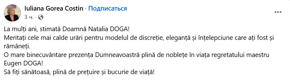 Natalia Doga, soția celebrului compozitor Eugen Doga, împlinește astăzi 86 de ani. „Să fiți sănătoasă, plină de prețuire și bucurie de viață!”, se arată într-un mesaj pe rețele.
