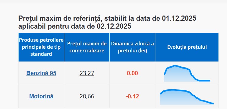 Agenția Națională pentru Reglementare în Energetică (ANRE) a publicat noile prețuri maximale de comercializare pentru principalele produse petroliere de tip standard, valabile pentru data de 2 decembrie 2025.