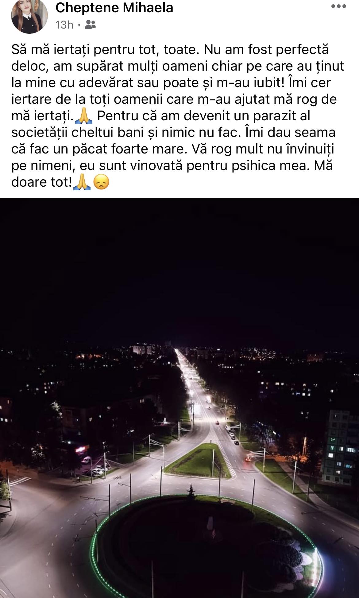 „Să mă iertați pentru tot, toate. Nu am fost perfectă deloc, am supărat mulți oameni chiar pe care au ținut la mine cu adevărat sau poate și m-au iubit! Îmi cer iertare de la toți oamenii care m-au ajutat mă rog de mă iertați. Pentru că am devenit un parazit al societății cheltui bani și nimic nu fac. Îmi dau seama că fac un păcat foarte mare. Vă rog mult nu învinuiți pe nimeni, eu sunt vinovată pentru psihica mea. Mă doare tot”, a scris tânăra pe pagina sa de facebook.