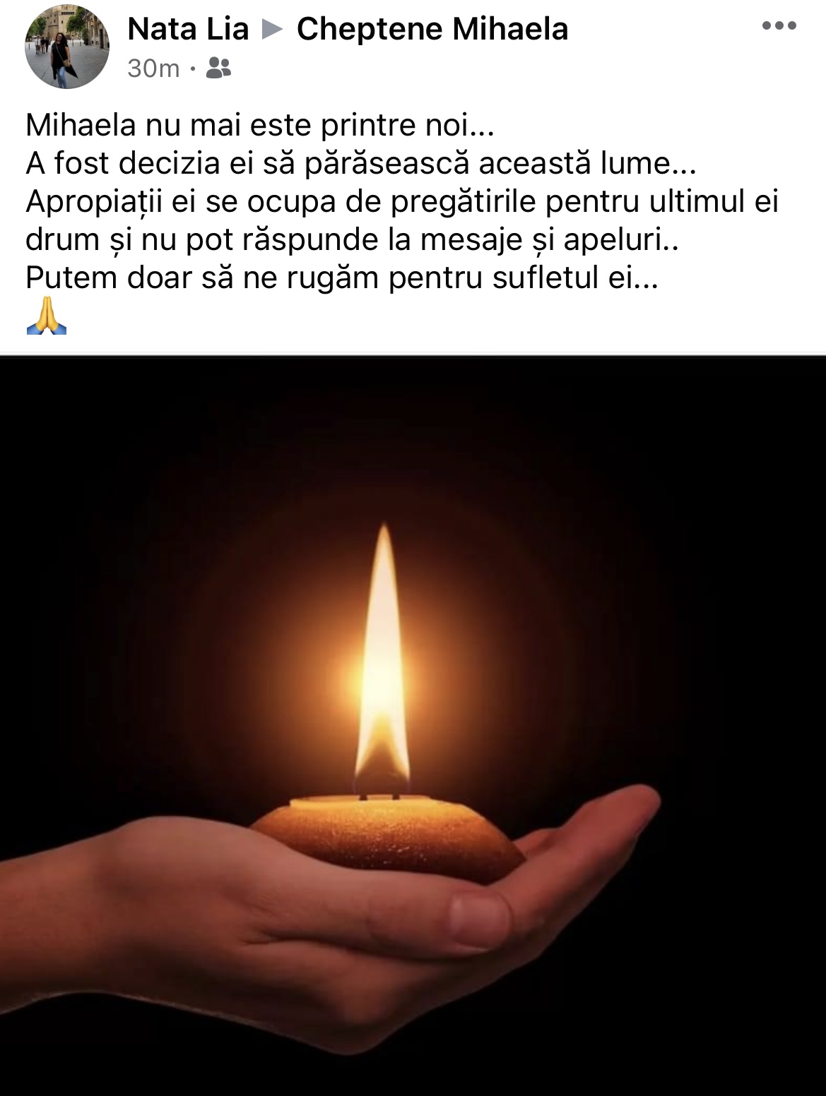 „Mihaela nu mai este printre noi. A fost decizia ei să părăsească această lume. Apropiații ei se ocupă de pregătirile pentru ultimul ei drum și nu pot răspunde la mesaje și apeluri.