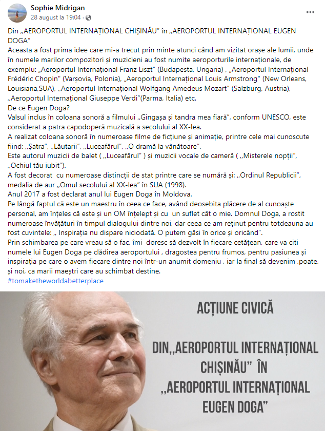 Prin schimbarea pe care vreau să o fac, îmi doresc să dezvolt în fiecare cetățean, care va citi numele lui Eugen Doga pe clădirea aeroportului , dragostea pentru frumos, pentru pasiunea și inspirația pe care o avem fiecare dintre noi într-un anumit domeniu , iar la final să devenim, poate, și noi, ca marii maeștri care au schimbat destine”, a menționat, într-o postare pe Facebook, Sophie Midrigan, elevă în clasa a X-a într-o instituție de învățământ din Chișinău.