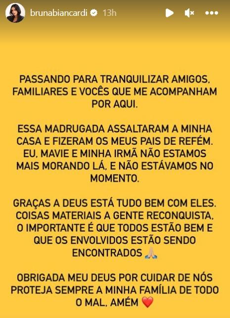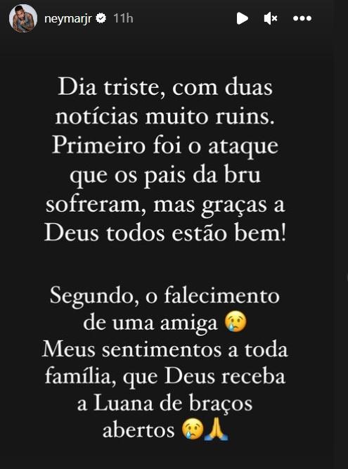 Bruna Biancardi a postat un mesaj pe Instagram, pentru a liniști prietenii și familia și a confirmat agresiunea. „Azi dimineață, hoții mi-au jefuit casa și mi-au luat părinții ostatici. Eu, Mavie și sora mea nu mai locuim acolo și noi nu eram în acel moment în casă. Slavă Domnului că totul este în regulă cu ei. Lucrurile materiale le putem recâștiga. Este important că toată lumea este bine și că cei implicați au fost găsiți. Îți mulțumesc, Doamne, că ai grijă de mine și că mi-ai protejat mereu familia de orice rău”, a scris iubita fotbalistului brazilian.