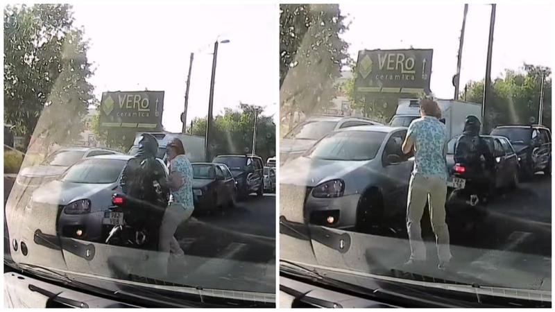 Un moment care îți taie respirația a fost surprins în plin trafic pe o trecere de pietoni din capitală. O femeie traversa regulamentar strada, când un motociclist a trecut ca o furtună la doar câțiva centimetri de ea.