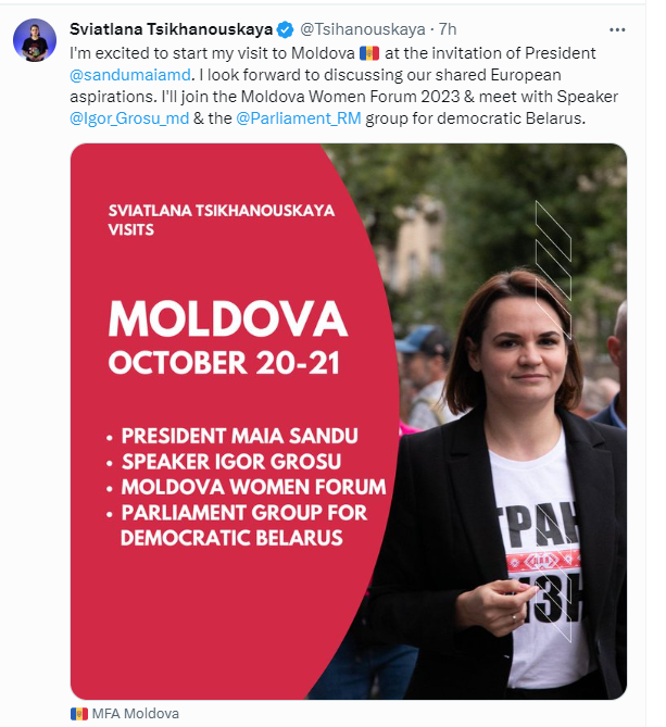 Și președintele Parlamentului, Igor Grosu, a anunțat despre vizita liderei opoziţiei belaruse la Chișinău: „La „Forumul Femeilor 2023” va participa și Svetlana Tihanovskaia, președinta aleasă a Republicii Belarus. Cu doamna Tihanovskaia am discutat despre situația din regiune și agenda bilaterală a grupului parlamentar pentru susținerea Belarusului Democrat, care a fost constituit anul trecut”.
