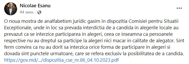 Sunt ferm convins că nu au dorit să interzică orice formă de participare în alegeri și dovadă sunt punctele următoare, care se refera exclusiv la posibilitatea de a candida”, a scris Nicolae Eșanu.