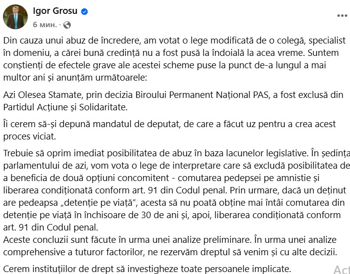 Trebuie să oprim imediat posibilitatea de abuz în baza lacunelor legislative. În ședința parlamentului de azi, vom vota o lege de interpretare care să excludă posibilitatea de a beneficia de două opțiuni concomitent - comutarea pedepsei pe amnistie și liberarea condiționată conform art. 91 din Codul penal. Prin urmare, dacă un deținut are pedeapsa „detenție pe viață”, acesta să nu poată obține mai întâi comutarea din detenție pe viață în închisoare de 30 de ani și, apoi, liberarea condiționată conform art. 91 din Codul penal.